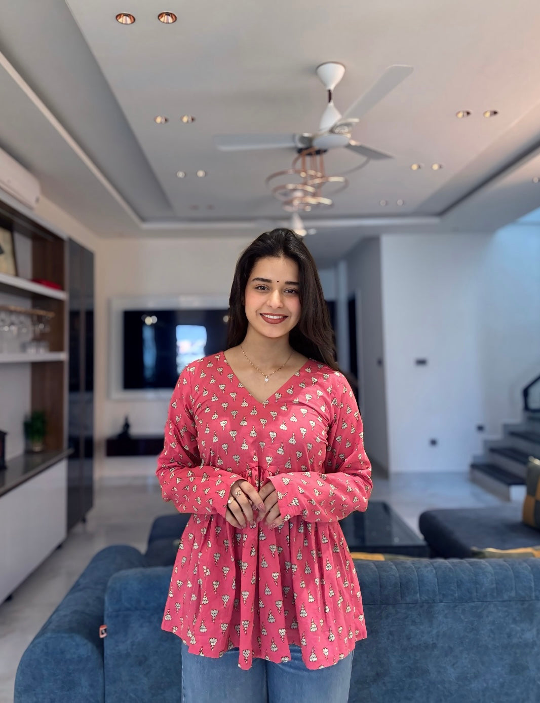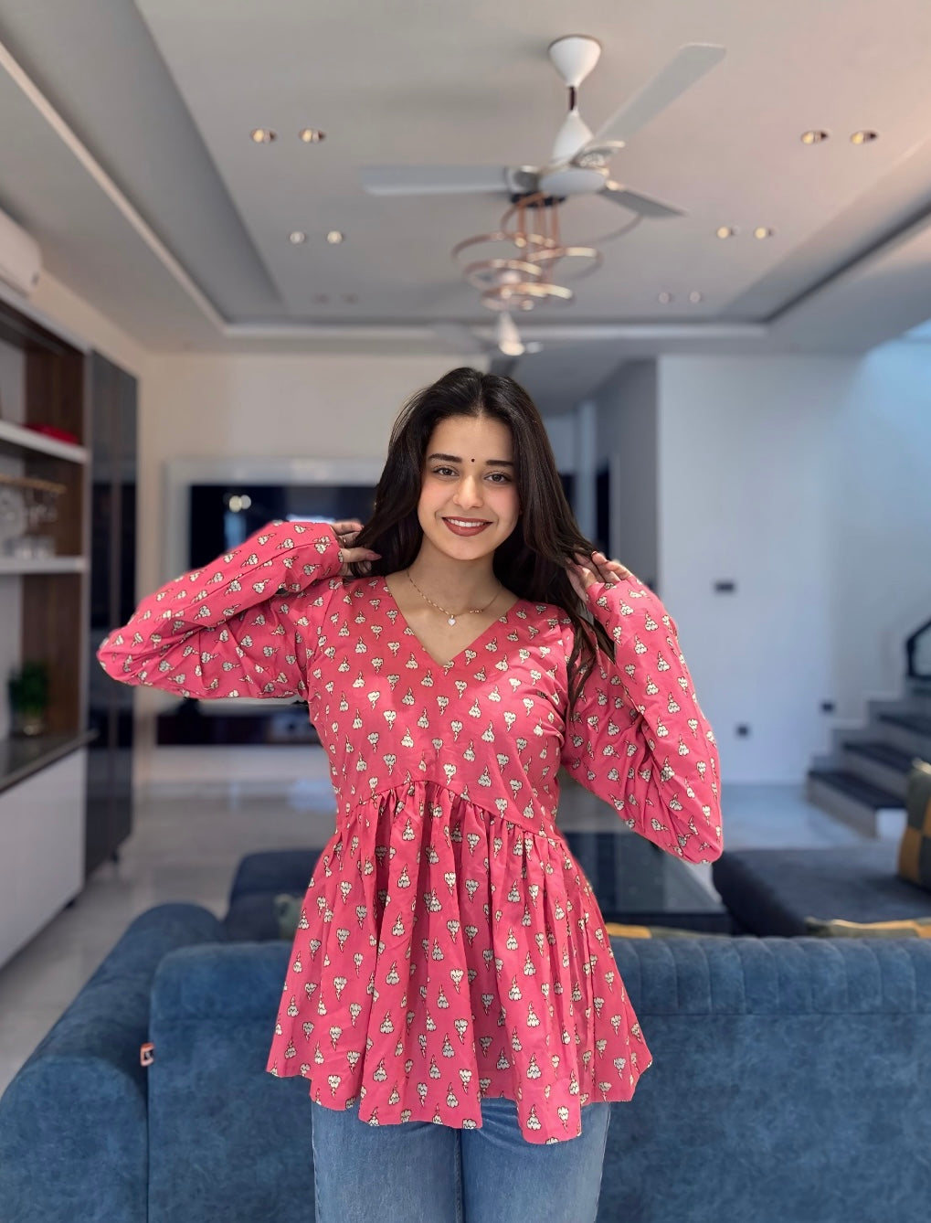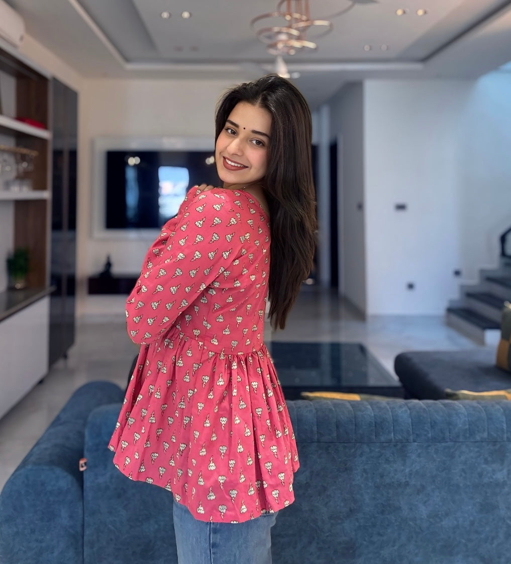 Have that DESI VALLA TOUCH this summer with our Pink Sky Peplum Short Kurti Top